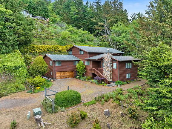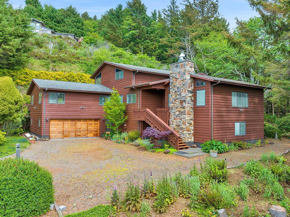 Situated above the scenic town of Yachats, this exceptional residence offers sweeping views of the Pacific Ocean coastline. With 5,807 square feet of living space the home provides a versatile layout suitable for both relaxation and social gatherings. The property offers five bedrooms, two full bathrooms, and two half baths, accommodating both family and guests comfortably. The lower-level recreation room offers flexible options for use such as a home theater, gym, or playroom. Set on an end-of the-road .67-acre lot, privacy is assured. The home will require updates to meet the preferences of its future owner, offering a unique opportunity to personalize this coastal retreat.
