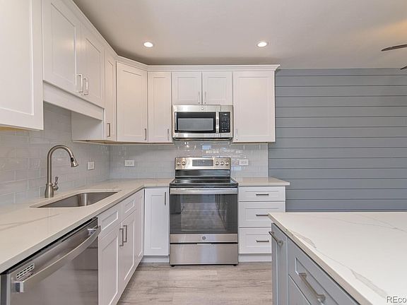 Beautifully remodeled penthouse condo with high-end finishes! Vaulted Ceilings! Peaceful location overlooking large courtyard, and building backs the private Windsor Gardens nature preserve and walking trail- and community gardens. This spacious condo is the dining room/area floorplan- 1200 sf, 2 bedrooms, 2 bathrooms, and includes 2 detached garages which is rare for this size. Kitchen has been opened up- all new cabinetry to include seating island, quartz slab countertops, glass tile backsplash, upgraded sink, fixtures, recessed lighting, and all new stainless appliance package included. Bathrooms remodeled with all new tile work, fixtures, tall vanity with quartz counters. COREtec vinyl flooring throughout main kitchen, front entry, and living room area. Bedrooms with new carpet. Outlook across courtyard. 3 wall a/c units. Screened in lanai with tile floor, new vinyl slider door included! Bonus storage room on same floor. **Windsor Gardens is Colorado's Largest Age 55+ Active Adult Living Condo Community. Did you know? Monthly HOA Dues include annual property taxes! And heat, water, sewer, trash, round-the-clock patrolling community responders, full time onsite association management, grounds/building maintenance, and activities department. Enjoy clubhouse amenities such as fitness center, indoor/outdoor pools, hot tub, sauna, billiards, library, craft rooms for ceramics, sewing, woodworking, and 9 hole par 3 golf course and restaurant both open to the public. Stay engaged with a wide array of activities, clubs, and events scheduled every month. Additional features include garden plot program, private walking trail and nature preserve, and RV/Boat storage. The Highline Canal runs full length along south side of the complex. RTD Bus Stops located thru-out the community. FHA/VA approved. Close to restaurants, stores, shopping...Minutes to Lowry, Hwy 225, Cherry Creek...Easy access to DIA and downtown. Come see for yourself what Windsor Gardens has to offer.