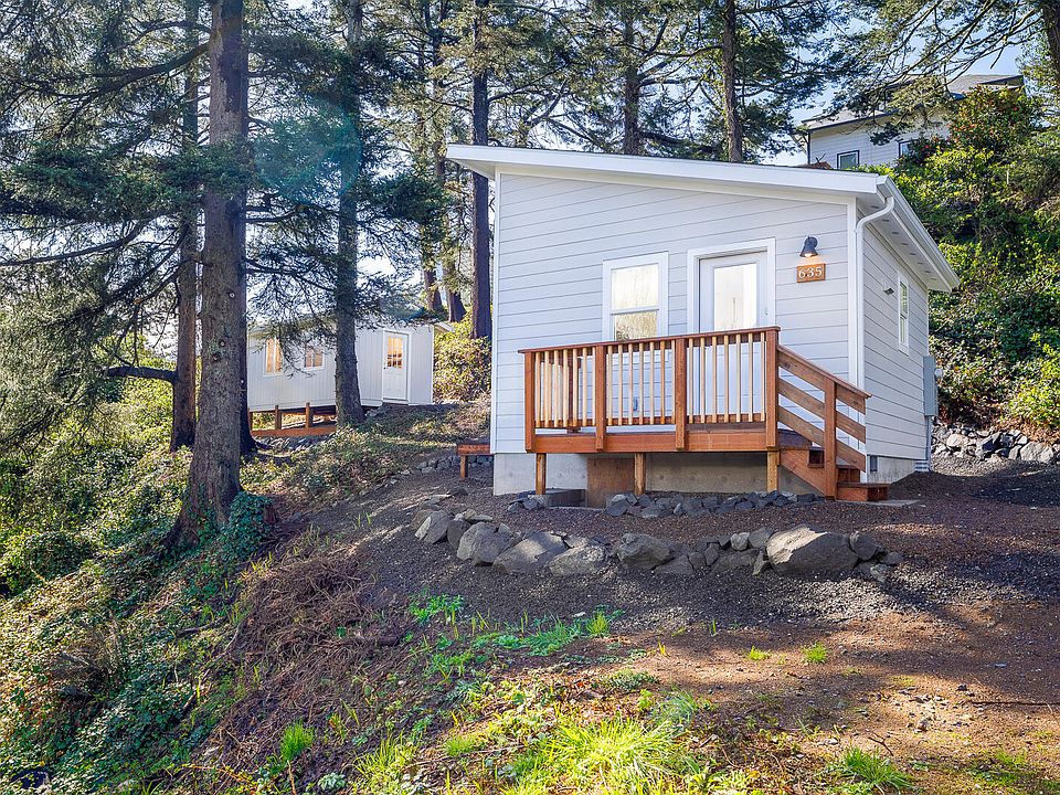 BRAND-NEW construction in this modern coastal getaway for the traveler or minimalist at heart! Bay view lot in private forest setting, yet extremely convenient location. Just above the popular Bayfront in Newport, you can walk to ''The Barge'' for a burger with the local fishermen, take the grandkids to the candy shops, or stay on your deck to listen to the sealions barking. This home has bright natural light and a clean look and feel. The hill provides protection from the Pacific storms, and you can watch the sunlight glisten off the water when the clouds clear. Additional 200sqft workshop for artists, crafters, or collectors. Natural, low-maintenance landscaping makes this the ideal retreat for those looking to relax and leave a small footprint on this beautiful land.