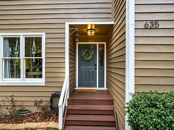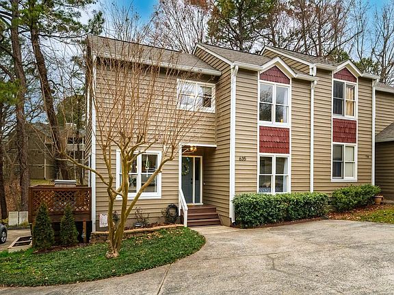 Don't let a little snow stop you from seeing this Woodcroft end-unit cutie! Meticulously cared for and updated with an eye for design, there's nothing left to do but make yourself at home. The floorpans in Woodwinds are a favorite for their vaulted ceilings, abundant natural light, and the flexibility a first floor bedroom and full bath provide. Upon entry, you're greeted by an eat-in kitchen with quartz countertops and a surprising amount of storage (check out that pantry cabinet!). A balcony off the breakfast nook is a great spot for morning coffee and makes grilling up a nice dinner as easy as it gets. Entertaining is fun with a conversational window from the kitchen into the formal dining room. The open living area and back deck give plenty of space for your guests to mingle. Yes, that's TWO outdoor spaces to enjoy (that your HOA maintains!) Upstairs, two more bedrooms and a Hollywood bathroom make for a great primary plus home office/gym/nursery combo. And don't overlook the storage. All the closets are generously sized, including a large walk-in closet in the primary suite. You've even got a storage room on your back deck, overlooking the fenced yard. Raised garden beds on the side of the house are perfect for a veggie/herb garden. When spring rolls around, you'll be pleasantly surprised by all the perennials that will pop up. If your private outdoor space isn't enough, not to worry, you're only steps away from the nature trails Woodcroft is famous for. Use the neighborhood paths and the American Tobacco Trail to get to Sprouts Farmers Market, Bean Traders, and Southpoint Mall in mere minutes. Being a short drive from HW 40 makes this one of Durham's most convenient locations. Get it while it's hot (before the snow melts!).