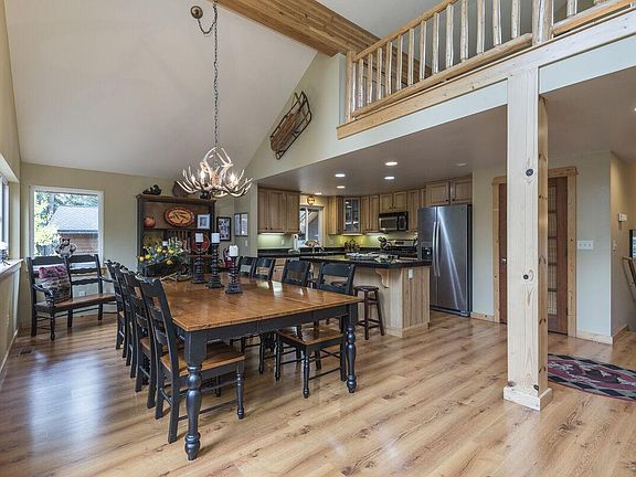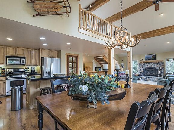 Large river rock fireplaceMountain themeOpen kitchenNestled among the treesAdjacent dining areaBar seatingStreet level access