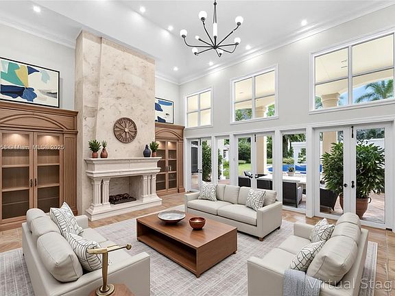 Elegant Mediterranean estate in the heart of Pinecrest on a sprawling 47,916 sq ft lot with 5,992 sq ft of living space. This 6-bedroom, 5.5-bath home features an open-concept layout with vaulted ceilings, wood-burning fireplace, and plantation shutters throughout. The gourmet kitchen, wet bar, and spacious living areas are perfect for entertaining. The primary suite offers his-and-hers vanities and custom built-in closets. Enjoy the outdoors with a beautiful pool, gazebo, and lush landscaping. A circular driveway with fountain and 3-car carport complete this exceptional property with a brand-new roof and completely repainted, designed for luxury and comfort.