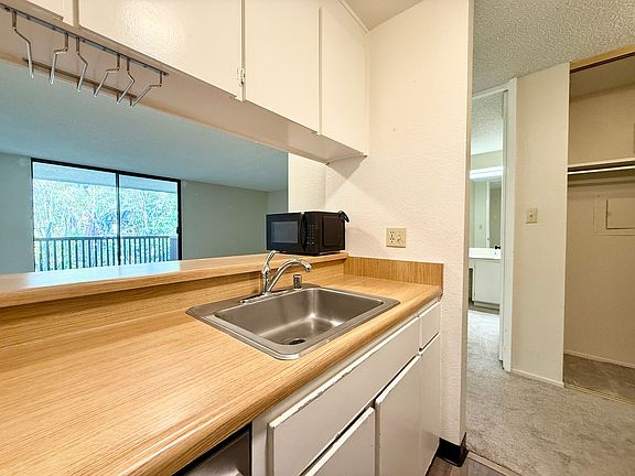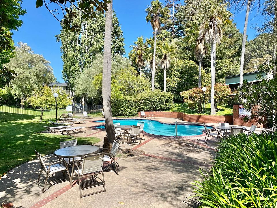 This top-floor unit features a galley-style kitchen, cozy carpeted living areas, a walk-in closet with built-in shelving and organizers, and a private balcony overlooking the courtyard. The kitchen is equipped with an electric range, refrigerator, countertop microwave, and dishwasher. Heating is provided by electric baseboards units. Residents enjoy access to a range of amenities, including heated indoor and outdoor pools, a jacuzzi, public laundry facilities, a fitness center, tennis courts, walking trails, and electric vehicle charging stations. The unit includes a designated storage closet and one covered parking space. Water and garbage services are included in the rent; PG&E and internet are the tenant's responsibility.