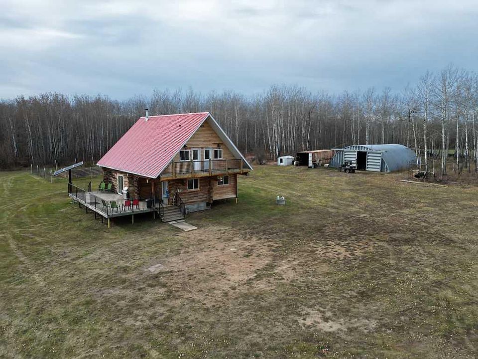 This is one of the most spectacular recreational properties you will ever find! A rare and extraordinary opportunity to own 160 acres of pure Alberta wilderness, completely surrounded by thousands of acres of untouched crown land - this is your private sanctuary. The stunning 1,550 sq ft log home is remarkable — warm, inviting, and built to impress. With 2 bedrooms, 1 bath, a grand living room with soaring vaulted tongue-and-groove ceilings, a cozy wood stove, spacious kitchen, and open dining area, it delivers that authentic lodge feel you’ve been dreaming of. The land is an outdoor enthusiast’s dream — a perfect mix of 30 acres of hay, forest, and a meandering creek flowing in from a nearby lake. Wildlife is everywhere: moose, deer, and waterfowl abound. Plenty of ATV trails right from your doorstep, explore miles of crown land, and experience the kind of peace and privacy few ever will. You have plenty of storage with a 40’x50’ quonset and sea can for all your toys, a 1,200-gallon cistern, septic with pump-out system, propane for fuel, and a reliable solar power setup. The wood stove keeps things cozy, and a propane line is already in place if you want to add a furnace. A true once-in-a-lifetime property — remote, remarkable, and absolutely unforgettable.