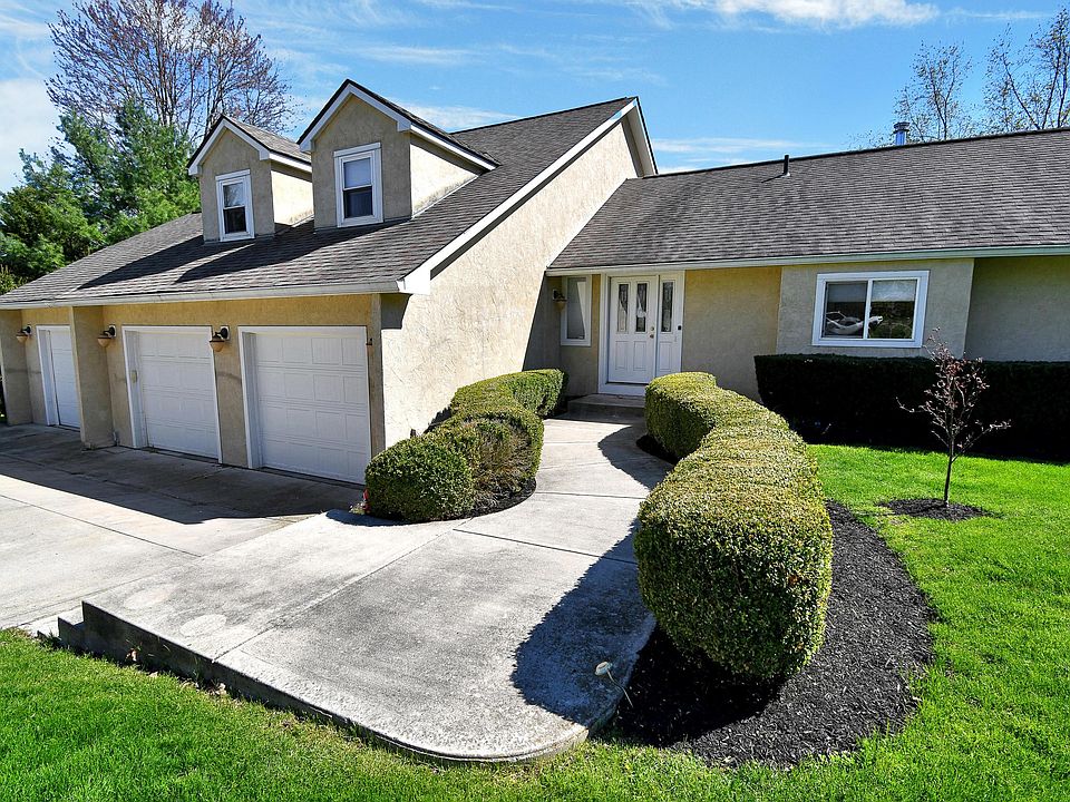 Gorgeous Contemporary Style Home that sits .92 acre lot-Vaulted Ceiling in living Room w/beautiful hardwood floors & a Wood Burning Stove-Stunning Kitchen w/white cabinetry, granite countertops, SS appliances, convection double ovens & Beverage Cooler-Dining Room/Eating Area-4 Season Room w/French Doors-Half Bath w/granite countertop-2 Master Suites-Upper Level has Master Bedroom & Master Bath-2 other nice size Bedrooms & Full Bath-. Lower level has a Den w/built-ins-Awesome 2nd Master Bedroom. Freshly painted walls throughout the house. Hardwood floors just redone! Large two tiered deck with a hot tub and a wonderful country view!