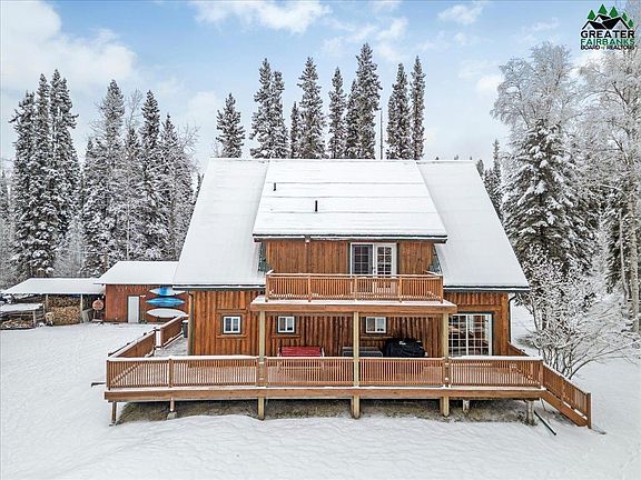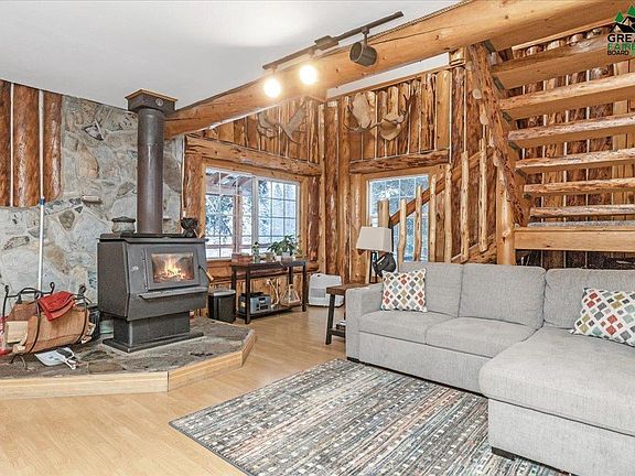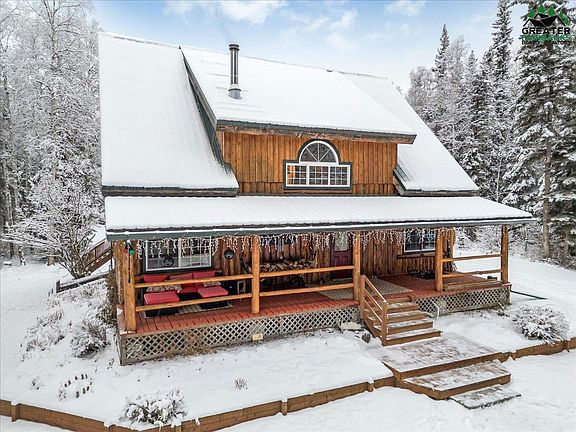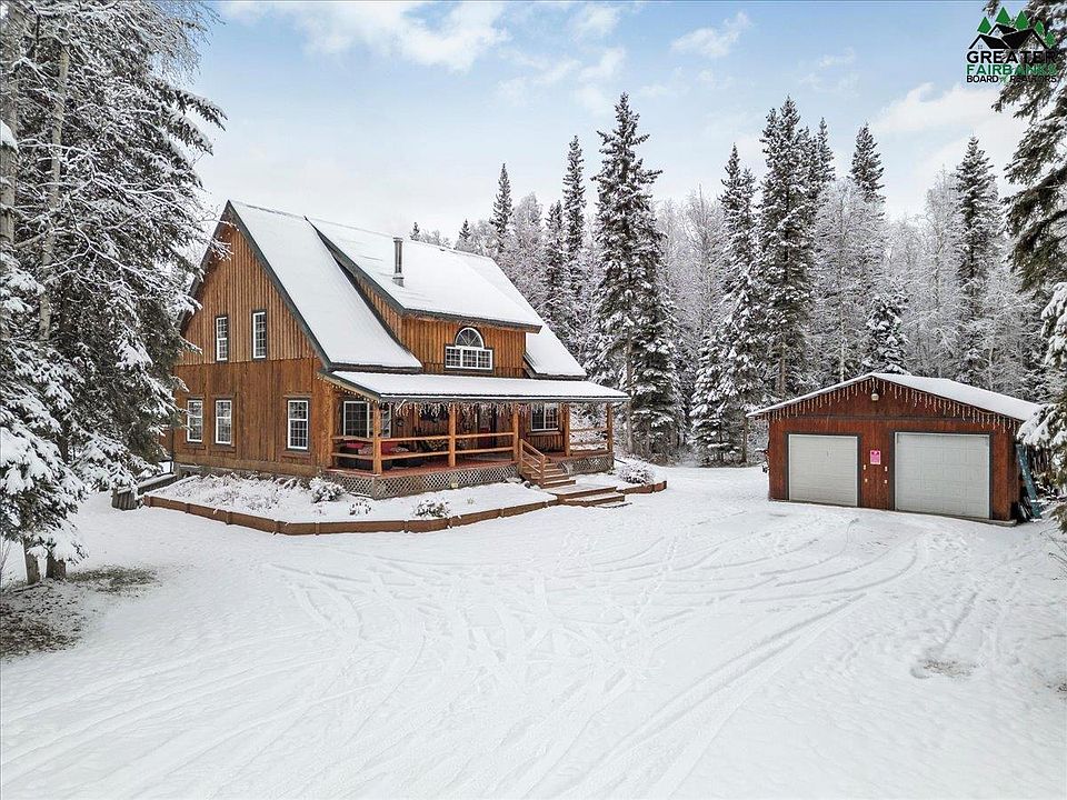 One-of-a-kind property on 10 private acres! Pride of ownership shows. This stunning 3 bedroom 2 bath custom log home tongue and groove ceilings, an open-concept, and expansive decks for outdoor living. The heart of the home is warmed by a high-efficiency Blaze King Ultra wood stove, with additional heat provided by a toyo stove. The kitchen includes butcher block countertops and flows seamlessly into the main living area. A 7' tall crawlspace provides exceptional storage or workspace potential. Additional features include a detached 2-car heated garage and a quaint guest cabin -ideal for visitors or rental income. Enjoy peace, privacy, and craftsmanship in a storybook wooded setting just 10 minutes from Eielson. Septic tank is for a 4 bedroom home and replaced in 2019, seller turned one of the 4th bedrooms into a living area.
