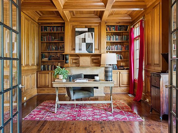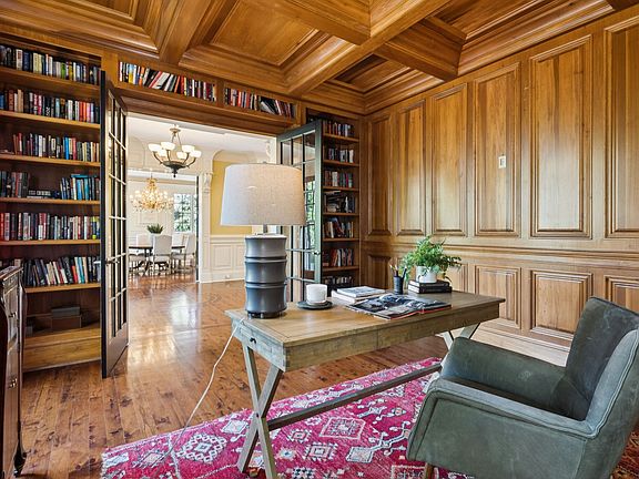 A dedicated work-from-home study exudes sophistication and warmth, wrapped in rich Ralph Lauren–style wood paneling, custom built-in bookshelves, and timeless architectural details — a space that elevates productivity and inspires creativity. The formal dining room is equally impressive, evoking the pages of Veranda magazine with its refined elegance and inviting atmosphere, making it the perfect setting for memorable gatherings.
