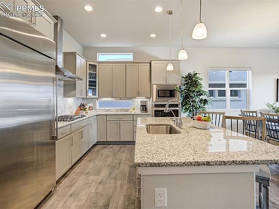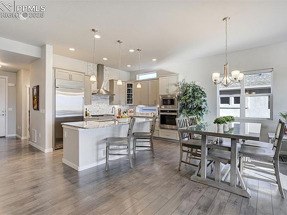 Welcome to main-level living at its finest in this exceptional ranch-style home nestled in the vibrant community of The Retreat at Banning Lewis Ranch, a "55 & Better" gated community! Thoughtfully designed with comfort, luxury & efficiency in mind, this home showcases owned solar panels, a spacious open-concept layout & breathtaking views of Pikes Peak & the Front Range from nearly every westerly-facing window. The heart of the home is a gourmet kitchen featuring an elegant Monogram fresh refrigerator, upgraded soft-close gray cabinetry, under-cabinet lighting, custom tiled backsplash, kitchen pantry & a generous island—perfect for entertaining. The 8’ doors add an airy, elevated feel, while passive solar and natural light flood the space from the large rear windows. Step outside to enjoy the covered composite deck, additional outdoor space under the deck is complete with retractable privacy curtains & the turf landscaping adds for a maintenance-free backyard. A walk-out basement with soaring 9’ ceilings is ready for your entertainment & is already plumbed for a wet bar in the spacious family room. Retreat to the primary suite where a picture-perfect view window captures the mountains & a stylish barn door leads into the en-suite with double vanities, a frameless glass shower with dual shower heads, and a built-in bench. Additional highlights include a cozy gas fireplace with stone surround and built-ins in the living room, central A/C, plumbed ready for a central vacuum system, an oversized 2-car garage & the scenic walking paths right behind the home. Schedule a viewing today & experience the perfect blend of a luxury home in an active community! Which includes a community center, fitness area, outdoor pool, pickleball courts, a dog run, etc... join various clubs & activities! Metro dues include front yard maintenance, trash service & snow removal service to your doorstep! Come experience the tranquility, convenience & stunning natural beauty this home offers!!