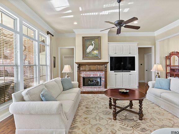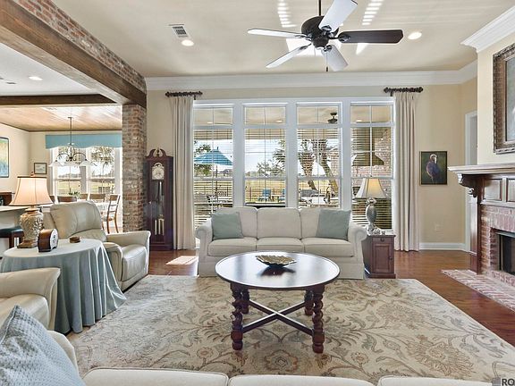 This amazing Custom-Built home by Waguespack Homes, offers so much, you just must experience it all. Home sits on the 7th hole of The Links Golf course with a lake view as well. Features 4 Bedrooms, 3 and 1/2 Baths, 2801 Living Area plus and extra half bath by the pool with a New Roof and optional Solar Panels. The backyards paradise offers a specially designed saltwater gunite pool with a chiller for the hot summer days and a hot tub for relaxation under the shaded Palm trees. The outdoor kitchen is fully equipped with a gas grill, granite island, TV for those sporting events, beadboard ceiling, aggregate flooring, specialty floor lighting and let's not forget the large stone firepit. The landscaping has a timed sprinkler system. Enter the front lead glass door to a very open floor plan, large Living Room with custom beams, millworks and brick hearth fireplace. The Formal Dining Room is enhanced by its recessed ceiling and triple crown molding. Kitchen features oversized island with granite counter tops, Commercial grade 6 burner Thermador Gas Range, spacious walk-in pantry and beautiful large plank wood flooring throughout most of the home. All baths feature slab granite counters with undermount bowls, makeup vanity, travertine stone flooring with large walk-in closets with built-ins. Primary Bath offers a 6ft. jetted tub and separate shower with a frameless shower door. Large laundry room with folding area. The Garage is oversized and is attached to a workshop as well or could be a Golf cart storage. The PosiGen Solar Panels save on utility cost (optional to remain) and the Briggs and Stratton Whole House Generator will keep you going during the storms. This home offers more than you can list. A must see today!