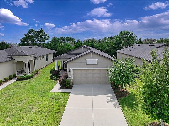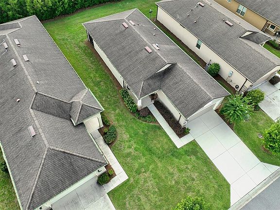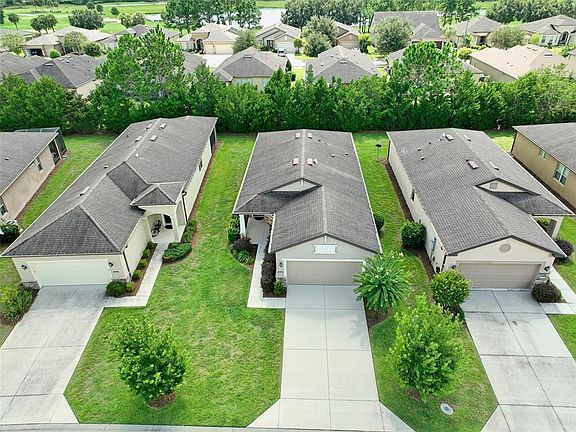 Relax and enjoy a more leisurely lifestyle in the guard-gated DelWebb golf community of Stone Creek with this bright and tasteful Longleaf Garden Home. Lawn maintenance, irrigation, weekly trash/recycling pickup & basic internet are included in the HOA fees. This home features many upgrades including cottage doors, baseboards and trim moldings, 18” ceramic tile floors on the diagonal, a whole-house window blind package & a beveled glass/wrought iron front door w/retractable screen. This very neutral Noir Coast floor plan boasts a bright, large eat-in gourmet kitchen with stainless appliances, ample granite counter space, upgraded wht 45” staggered wood cabinets with dental molding, soft close door hinges and drawers, corner lazy-Susan, pull out cabinet shelves & is conveniently located at front of home for ease of unloading groceries. The handy kitchen pantry and entry drop zone are also easily accessible in rear hallway to garage. The open floor plan provides clear views throughout main living areas, from front door to lanai & beyond. The combination dining and living room areas are situated perfectly for entertaining, w/quick access to kitchen and fully covered screened lanai. The pocketing slider doors from the living room to lanai provide an enlarged opening for ease of entertaining between spaces, and also unobscured views of the lanai & lush backyard privacy berm. The tranquil Primary Bedroom is located away from traffic noise at the rear of home for a good night’s sleep, has an upgraded tray ceiling and will accommodate a king sized bed w/night stands. The bright spa-like ensuite Primary Bath is equipped w/beautiful wood vanity, dual sinks, granite countertop & pocket door from bedroom for enhanced privacy/noise control. The transom window over the large easy-to-clean shower area provides additional light while still providing privacy. The ample Primary walk-in closet contains a built-in dresser and numerous built-in shelves to allow for various storage configurations. A much sought after Guest Bedroom with a nice sized reach-in closet is tucked away in its own wing for maximum guest privacy and comfort. The well appointed and easily accessed Guest Bathroom is just steps away with a single vanity, quartz countertop, tub/shower combo with an easy-to-clean surround, plus a linen closet conveniently located in the adjoining hallway. The spacious laundry room provides room for laundry baskets/hampers, cleaning supplies, pet beds/supplies, other storage needs, or even a small home office. The 2 car garage includes insulated garage door, a wall tool storage rail & upgraded hybrid water heater. Enjoy the DelWebb 55+ lifestyle of the Stone Creek community with many amazing amenities including a membership-optional semi-private golf course, Full Service Health and Fitness/Spa Center, Heated Resort Outdoor Pool and Heated Indoor 25 meter Lap Pool, 5 Tennis Courts, 16 lit Pickleball Courts, 8 Bocce Ball Lanes, Basketball Court, Horseshoe Pits, Community Garden, Dog Park with agility course, Softball Field, numerous Fishing Ponds and miles of walking, biking, golf cart trails and optional RV storage. Socially active, with a dedicated Lifestyle Director and Spa Director and 60+ clubs and interest groups to join, Stone Creek is located within proximity to golf, shopping, dining, medical services, the World Equestrian Center, local attractions and numerous outdoor activities. *All room dimensions are approximate; Buyer/Buyer’s Rep to verify*