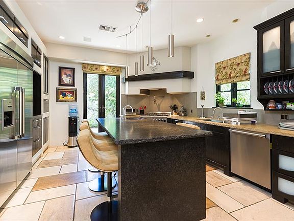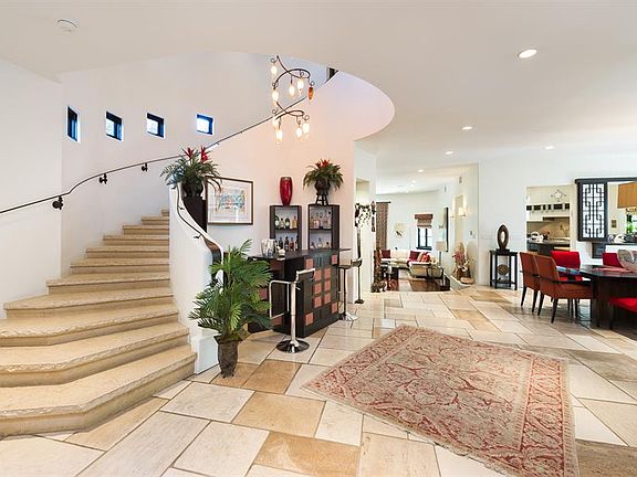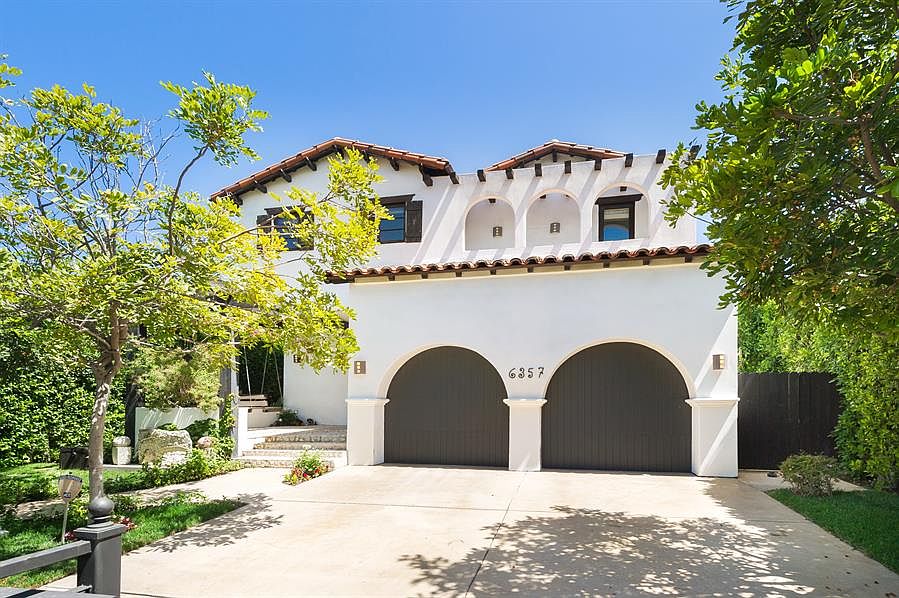 An immaculate Spanish-contemporary set behind lush hedges and a private driveway, with every convenience just minutes away. Meticulously crafted, this home boasts soaring ceilings, a grand staircase, bar area, large formal-dining area, and a step-down-living room that leads outside to a limestone patio, veranda and fire pit. Dark wood beams accentuate the second story ceiling, a fabulous focal point surrounded by 4 upstairs bedrooms, 3 bathrooms, and multiple balconies. The downstairs offers an additional guest bedroom/office with a full bath, a gourmet kitchen equipped with state-of-the-art stainless steel appliances, and granite-stone countertops. A superb home on a tranquil street just minutes away from The Grove, Beverly Center, Beverly Hills, West Hollywood, Melrose shopping and restaurants.
