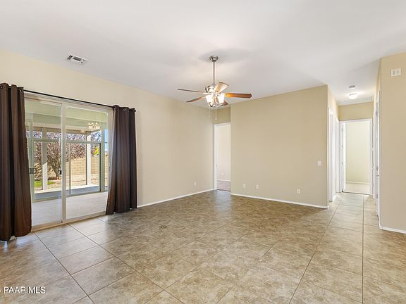 Tucked away on a less-traveled interior street and with north/south exposure, this turn-key 1,483 square foot Granville home is ready and waiting for you! Tidy and colorful landscaping provides welcoming curb appeal. The popular split floorplan centers around open, great room concept living, perfect for quality family time or entertaining. A well-designed and bright kitchen features plentiful countertops with eat-at casual seating, gas range, and a handy corner pantry. The adjacent dining area is spacious enough to accommodate a large gathering. Dual sinks and a roomy walk-in closet make the primary suite comfortably built for two. The finished, heated and cooled sunroom is a wonderful bonus space you'll love using nearly year-round. Laundry is a ''go'' with an included Whirlpool washer & dryer set. Tile and brand new carpeting, classic two-tone paint, and lighted ceiling fans are found throughout. Relax on your covered patio while enjoying the easy-care backyard starring paver pathways, evergreen artificial turf, and a shed for storing tools and toys neatly away. A 4-foot extended garage means parking larger vehicles is no problem, and cabinetry is on hand for additional storage. Post-tension foundation, 2x6 framing, 10-foot ceilings and 8-foot doors are all valuable construction components. Take advantage of Granville's extensive community amenities for all ages and life stages. Best of all, this prime Prescott Valley address gives you effortless access to shopping, entertainment, restaurants, medical facilities, Pioneer Parkway, and more.