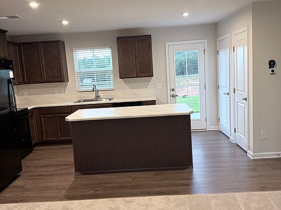 The main level features an open-concept floor plan with high-end finishes throughout. The kitchen includes a massive granite enter island, cabinets, and a separate dining area, all flowing seamlessly into a spacious and light-filled living room. while LVP flooring is in kitchen. Additional features on the main floor include a convenient half bath, access to a private back patio with a peaceful wooded view, and an attached two car garage.