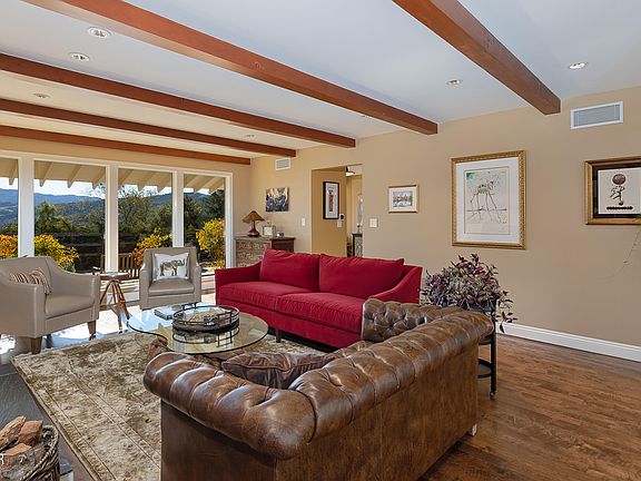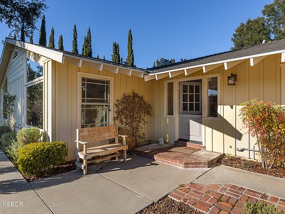 Spacious 5 bedroom 4 bath home with views of the Alisal hills and coastal mountain range. Privately situated on an elevated lot at the end of a cul-de-sac. Enter through the charming Dutch door to this beautiful home with formal and casual entertaining areas. Cozy living room has beamed ceiling, wood burning fireplace and is flanked with floor to ceiling windows on two sides. The well-appointed kitchen has walls of custom cabinetry, pantry, custom center island and French doors to the rear deck. Wow your guests with picture-like views through the oversized and clearstory windows in dining room and west ensuite bedroom. Primary bedroom is complimented with French doors to the exterior, cedar lined closets and ensuite bath with dual vanity, steam shower, jetted tub and bidet. There is a centrally located large family/media room. Home is outfitted with tasteful finishes, dark wood flooring, Milgaard windows and plantation shutters. Large detached garage mimics the cottage style home and has a 1000 bottle temperature-controlled wine room. Wonderful deck with arbor and fountain await you in the rear yard. Landscaping includes graceful lawn, hedges and decomposed granite areas, many fruit trees (plum, Meyer lemon, lime, apple, orange & mandarin orange, grapefruit and pomegranate) roses, raised garden beds and greenhouse. Floor plan is well suited for dual living, multiple office spaces, large family or possible ADU conversion. NOTE: Floor plan is not to scale.