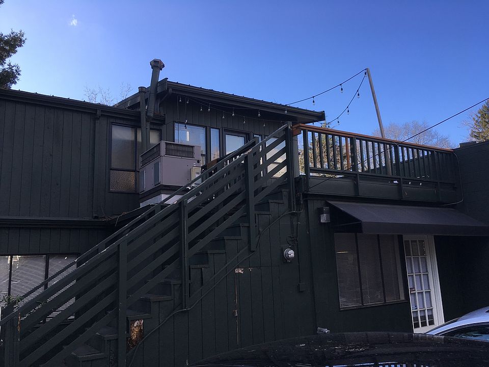 Huge deckOutdoor entranceLots of natural lightThree large open areas