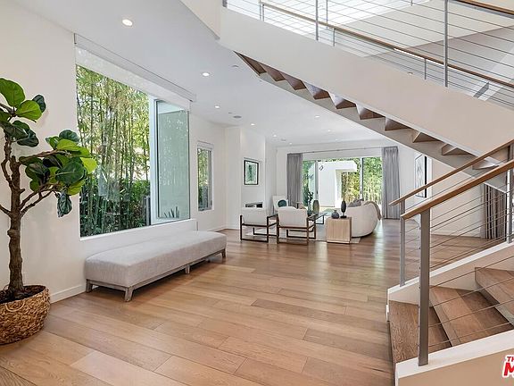 This spectacular architectural home, tucked behind gates and lush, mature hedges, offers complete privacy. Designed for effortless living and elegant entertaining, the expansive open floor plan features Fleetwood sliding glass doors that seamlessly connect indoor and outdoor spaces. Highlights include high ceilings, wide plank wood floors, walls of glass, and a custom floating staircase. With 4 bedrooms, 6 bathrooms, and a spacious upstairs family room (which could be converted into a 5th bedroom), the home showcases quality finishes and thoughtful details throughout. The entertainer's backyard boasts a pool, spa, covered lounge with a fireplace, and a cabana that serves as the 6th bathroom, complete with double outdoor showers. It's the perfect retreat for large gatherings or intimate evenings. Situated in one of LA's most desirable, walkable neighborhoods with tree-lined streets, it's just a short stroll to coffee shops, cafes, farmers' markets, dining, shopping, and entertainment.