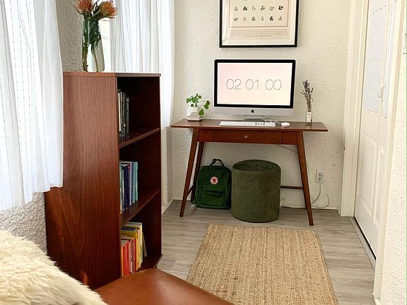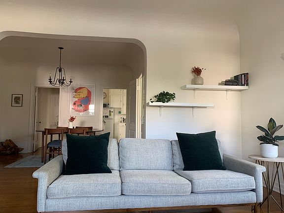 Lower unit in 4-unit building. Roomy two bedroom with one bath plus office/studio; spacious living room with wood burning fireplace, and dining room with hardwood floors throughout. Large kitchen with refrigerator and free standing range. In unit laundry room. Lots of closet space/storage. One garage space. Permit parking on street is only $34 a year and parking is available. New electrical. Owner pays water and gardner. Tenant pays power and gas. Unfurnished. No Pets/animals.