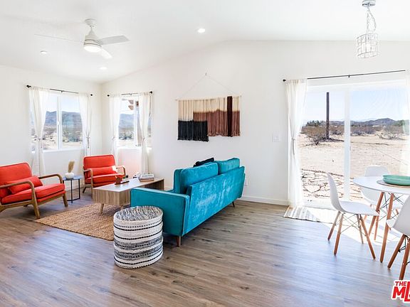 Set back from the road, this custom-built desert retreat sits on 3.25 acres and offers sweeping mountain views and a tranquil natural landscape, perfect for serene desert living. Cool off in the cowboy tub, cozy up by the fire pit, stargaze in the hammock, or relax under the covered patio. Inside, stunning vistas are visible from every window, and cohesive flooring adds a touch of sophistication. The open floor plan with vaulted ceilings is bright and airy with direct access to the patio, ideal for entertaining and breathtaking sunsets. The modern kitchen features brand-new stainless-steel appliances and flows seamlessly into the dining area. The primary bedroom with park views includes an en-suite bathroom with a custom-tiled walk-in shower. Ceiling fans and mini-splits throughout ensure comfortable cooling and heating. Fully permitted with solar included and paid for. Conveniently located near Joshua Tree National Park, downtown Joshua Tree, Mas o Menos, and hiking trails, yet far enough away to enjoy your solitude. Furnishings, art, and accessories can be included, making this an instant personal sanctuary or Airbnb-ready.