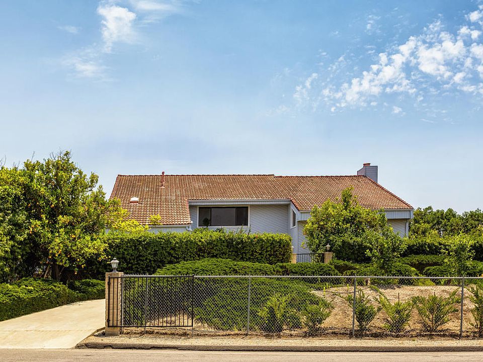 Price reduced. Custom view home with a view from every room. Large 4,253 sf. (per seller) home sitting on 2.5 acres planted to avocados and oranges. Incredible views all the way to the ocean. 2 large bedrooms and bathrooms upstairs and one each downstairs. Included in the square footage is a large 1 BR/1BA detached guest house with an attached storeroom which could be a shop, another bedroom or another garage. This home is graced by a great room with nearly 25 foot ceilings with a massive fireplace and a wall of windows to the orchard, a library with a 2nd fireplace upstairs. There is a fenced patio, a large 2nd story balcony, a viewing deck at ground level, a circular driveway, dual air conditioners and a basement. New exterior paint and new insulation in the attics. This is a one of a kind home.