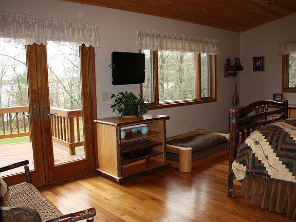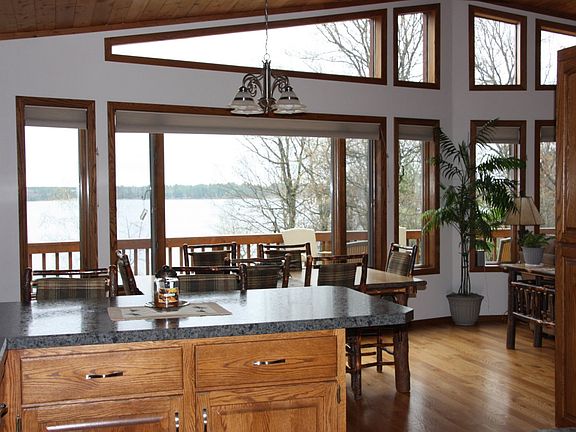 Exquisite lake home on the southern shores of this sparkling clear waterway! Enjoy luxury lakefront living with an impressive prow front design, rustic themes and many updates! Ample hardwood floors, impressive master bedroom/bath, oak kitchen, and pine accents. Lakefront views from most areas of the home, including a unique porch with impressive stone fireplace. Beautiful landscaped grounds, full irrigation system, sauna & spacious garage round out the package!