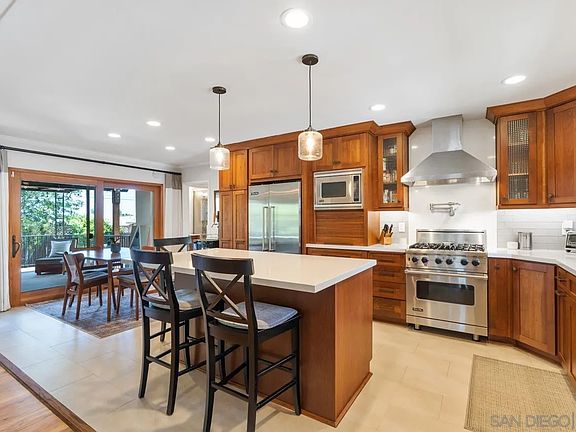 Serene single level home in fabulous Del Cerro with lovely curb appeal. Owned solar. Gorgeous modern kitchen with Viking range, refrigerator, and wine fridge. Open floorplan. Hardwood floors. Expansive stacking glass sliding doors open onto a large zen covered lanai overlooking a grassy backyard with mature landscaping and fruit trees. 4 spacious bedrooms with 2 updated bathrooms. Plantation shutters. Fresh interior paint. Large 2 car garage with epoxy flooring and built-in storage.