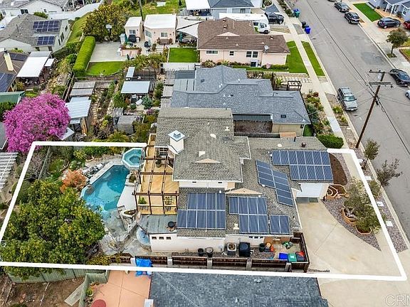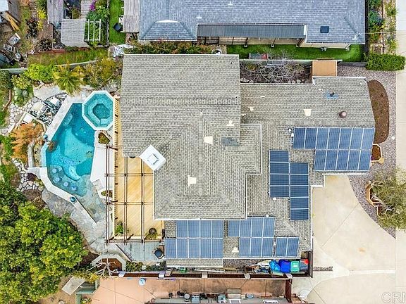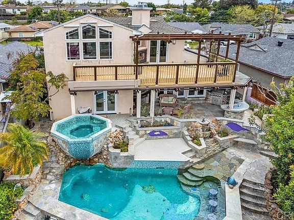 Welcome to Paradise. This stunning residence captures the very essence of resort style living with exquisite attention to detail wherever the eye lands. Your heart will skip a beat when you explore the magical custom designed pool with elevated spa. This oasis is an absolute show stopper, along with the covered outdoor lounge with kitchen and fireplace. The first floor interior includes a chef's kitchen (with adjacent prep area) that seamlessly blends with the dining and living areas. Custom architectural details, another fireplace, and glass doors that spill open to the exterior lounge and water features, complement these living areas. The primary bedroom with walk-in closet is perfectly situated next to the spa, and boasts a recently completed primary bath that is beyond awesome. Two more bedrooms and another full bath complete the first floor. Upstairs you will discover an open concept area with soaring ceilings and great views, another custom bath, and another fireplace - this one double sided so it can also be enjoyed on the expansive outdoor view deck. The second floor is currently arranged for a generously sized home office and second living area, and some of the space could easily be reconfigured to a second primary suite. The possibilities are endless. The love and artistry of the owner designers is apparent from every vantage point of this residence, both inside and out. The attention to detail, especially with the extensive awe inspiring tile work, and breathtaking pool and spa, make this property both an object of art and the ultimate residence where you can truly live your best life. And now for more details. Complete remodel and 2nd story addition by seller. Pool/Spa/Back yard designed/built by seller. All newer plumbing (including main sewer line to street,) electrical, panels and sub-panel. newer sub-flooring with insulation. Drainage system thruout property with rain gutters connected. Solar panels. Central vacuum. Tankless water heater. Milgard windows. Regarding the Pool/Spa - custom designed and spa manufactured specifically for seller (fiberglass shell,) salt water, fully automated system with hand remote, phone app and spa side remote, pebble sheen plaster, multiple lighting options, hand painted ceramic pieces thruout pool, swim jets for swimming laps in place, "Baja" beach entry, bar stools in pool with adjacent bar, outdoor shower (hot water) next to spa.