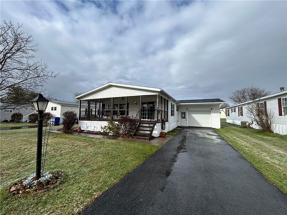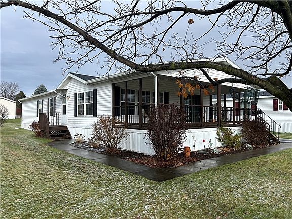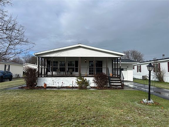 Well-maintained 3 bedroom, 2 full bath manufactured home in the desirable Gypsum Mills park setting! Featuring an open concept living area, large kitchen with ample cabinet space and added pantry, and combined dining area. A private primary suite has its own full bath and HUGE walk-in closet. Two additional bedrooms provide flexibility for guests, a home office, or hobbies. The attached garage adds extra storage and convenience, located off the laundry room for easy access. Enjoy time on the covered front porch, and don't forget about the extra storage space in the shed. New flooring and updated windows throughout. Furnace approx 4 years old, hot water heater approx 2 years old and roof approx 6 years old. Park has many great amenities: a community center with kitchen and space for private parties, fitness center, outdoor heated pool, access to Winding Creek Executive Golf Course (for a minimal charge), basketball, tennis, pickleball, bocce, horseshoes, shuffleboard, storage for your RV (for a minimal charge) and a 1.5 mile walking trail around the park. Easy one-level living close to shopping, restaurants, and major routes. Just up the road from idyllic Canandaigua Lake! Ideal for downsizing, first-time buyers, or anyone seeking affordable comfort!