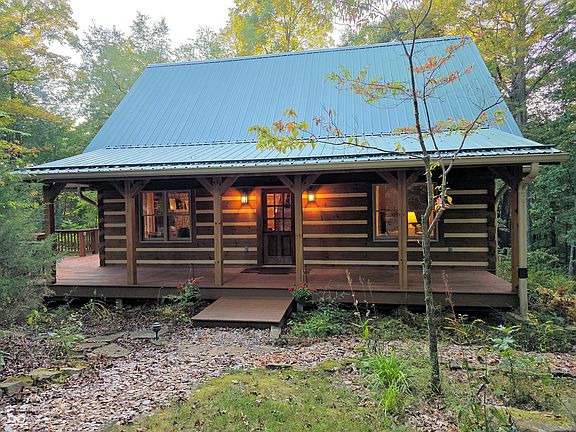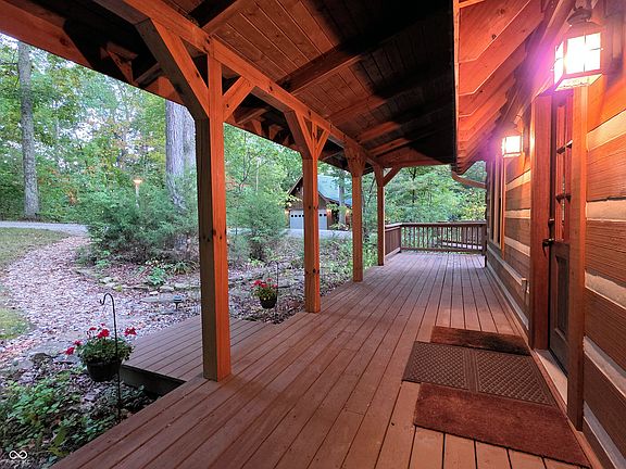 Welcome to a Brown County cabin retreat where comfort, craftsmanship, and conservation meet. This 3-bedroom, 3-bath square-log home with a metal roof is meticulously maintained and offers nearly 4,000 sq ft for relaxing or entertaining. Set on 10.71 acres on a private road, the property carries a "Classified Forest" designation that helps keep taxes low. The Seller has protected this land, planting natives, excluding invasives, and posting pollinator habitat signs to guide future stewards. There's a circular drive to the home and a matching 24'x24' garage with covered porch and loft storage. A pond with paths and a footbridge enhances the tranquil setting. Outdoor living includes a covered front porch for quiet mornings and expansive side decks for gatherings. Inside, the main level features an open living/dining/kitchen anchored by a Brown County Stone hearth with a gas stove. Hardwood floors, custom cabinetry, and an island with Corian countertops underscore quality. This level also includes a bedroom and a convenient laundry/full-bath combo. This original section of the cabin provides stairs to both the second floor and another to the finished basement. Upstairs, the primary suite's bath also opens to the hall, serving the second bedroom. Both upper-level bedrooms have vaulted ceilings. In the back addition, you'll find a light-filled family room with a beamed ceiling, windows, and deck access, a generous kitchenette/bar with custom cabinetry and Corian counters with plenty of room for a game table or extra dining. Stairs here also lead to the beautifully finished walk-out lower level. This poured-concrete basement is clean and dry, with a large family room, a guest area with a full bath, and an oversized utility room for mechanicals. From top to bottom, the home shows extraordinary care. Beyond the pristine walls, the land tells a story of stewardship and respect for nature, ready for new owners who will cherish both the home and the habitat it protects.