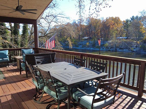 Scenic tippecanoe riverCovered cedar deckSteel beam reinforcementsAdirondack polywood chairsWhitewashed boxcar wood ceilingsShiplap accent wallsTop-of-the-line appliances