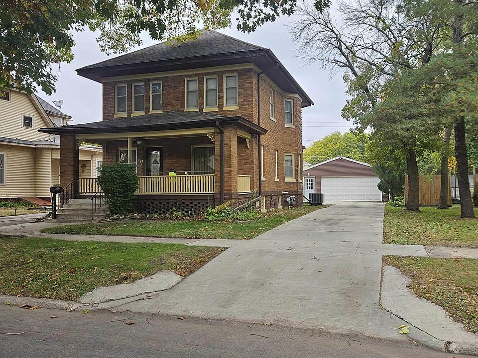 Welcome to this beautiful 4-bedroom, 3-bathroom brick home offering timeless character and modern comfort. Step inside the welcoming foyer to find a spacious open living and dining area, perfect for entertaining or relaxing with family. The kitchen provides plenty of storage and workspace, making meal prep a breeze. This home is equipped with forced air heat and central air conditioning for year-round comfort. All appliances are included, making this truly move-in ready. Enjoy quiet mornings or evening sunsets from the open front porch, complete with a cozy porch swing. Outside, you’ll find two detached 2-car garages — one with driveway access from the street and another with convenient alley access — plus an additional cement pad for extra parking or recreational use. With its classic brick exterior, generous layout, and thoughtful features throughout, this home offers both charm and practicality in one perfect package!