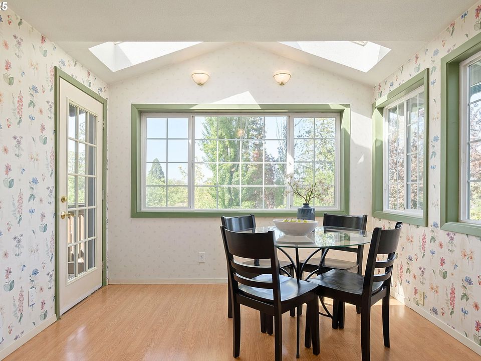 - Features: Appliance Garage, Dishwasher, Disposal, Eat Bar, Garden Window, L Shaped, Nook, Skylight, Free Standing Range, Quartz, Solar Tube