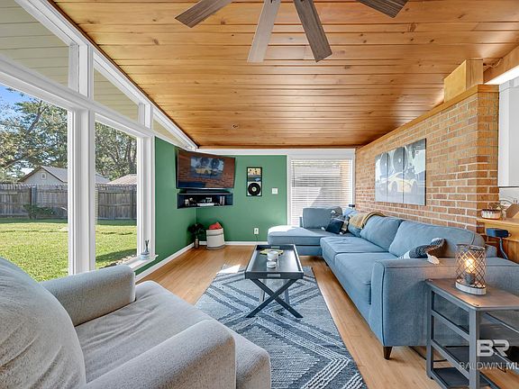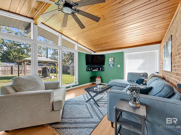 Cool and character filled 3-bedroom, 2-bath home in a well-established neighborhood featuring tongue-and-groove ceilings, natural light throughout, and stylish updates. Each bedroom has its own sliding glass doors leading to private outdoor spaces. The inviting great room offers a gas fireplace and a full wall of windows overlooking the manicured backyard. The galley kitchen is equipped with a gas stove and opens to a spacious grilling area ideal for entertaining. Through the French doors, a bonus room or formal dining room provides flexible living space that leads to the back porch and large backyard. This home is loaded with upgrades, including a whole-house generator, tankless hot water heater, gas appliances, and a Bronze Fortified roof for added peace of mind.Truly a one-of-a-kind property that combines charm, comfort, and convenience—NO HOA just minutes from downtown Foley, OWA, restaurants, and a short drive to the Gulf beaches. Buyer to verify all information during due diligence.