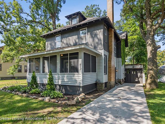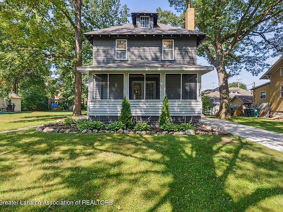 Welcome to this grand 5 bedroom home within walking distance to Michigan State University! You'll love the hardwood floors throughout most of the home, the main floor primary bedroom with a full bath across the hall, the huge kitchen and formal dining room, large living room, screen porch to enjoy warm summer evenings and the stately architecture of this American Foursquare. So many features including the main floor laundry, 4 bedrooms and a second full bath on the second level and walk up access to the attic for extra storage. The lower level has 2 additional rooms, great for offices or more storage. New sewer line was installed in 2020 along with new concrete driveway. Freshly painted with a neutral color, just move in and enjoy!