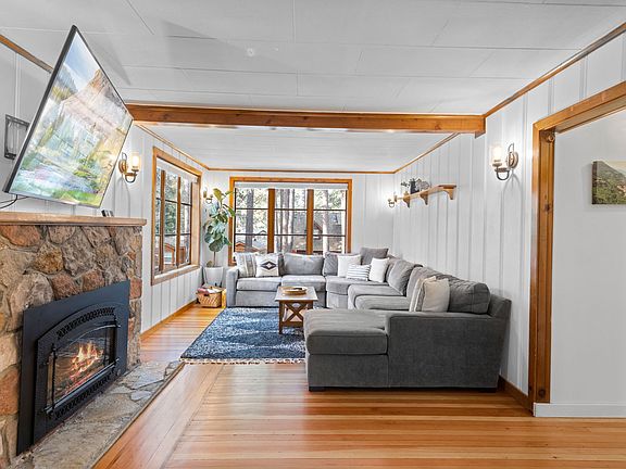 When you enter through the front door, there is a mudroom for convenient changes and snow gear storage. The mudroom opens to a living area with a large sectional, 65" TV, original picture windows, and a gas fireplace for a cozy ambiance.