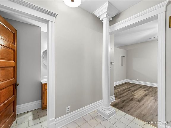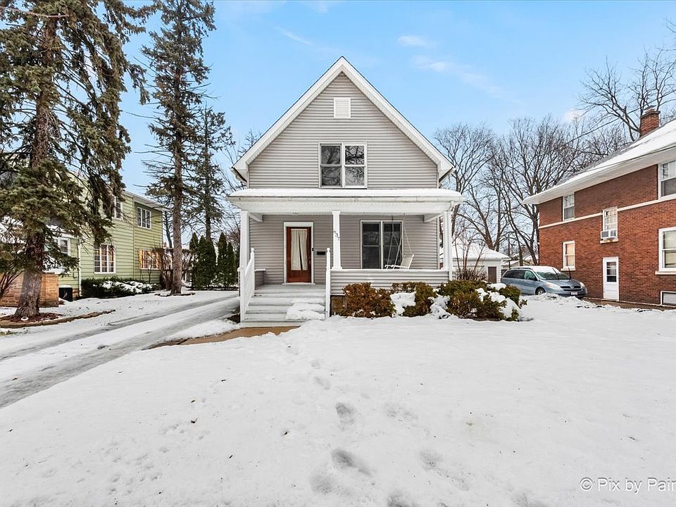 Charming 3 bedroom, 2.1 bath, 2 story home with tons of modern updates! Full basement, ensuite master bedroom, garage and deck! An extra long concrete driveway and covered porch with a cozy swing is just the start. Step inside the foyer to a powder room and large walk-in closet. Fresh paint, original doors and trim flow throughout. Living Room with built-ins and new flooring that flows through to the separate dining area with a big bay window. Spacious kitchen with ample cabinets and counterspace, center island, planning desk and eat-in area with glass sliders that lead to the backyard. First floor bedroom or office with hardwood floors. Upstairs are 2 more sizable bedrooms including the master bedroom with walk-in closets and ensuite bath with shower stall, and a full hall bath with oversized vanity and shower over tub combo. A full basement offers tons of additional space and possibilities. The fully fenced backyard is the perfect place to relax with a wrap-around deck, plenty of greenspace, garden beds, and 1car garage. Walking distance to parks and the Fox River and nearby downtown Aurora and all its amenities.