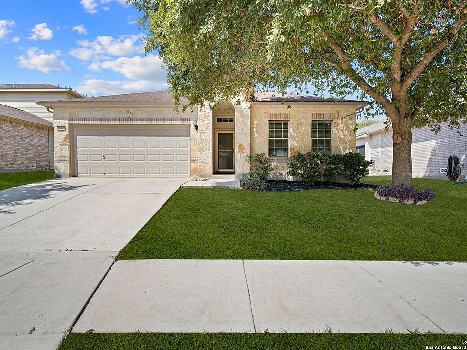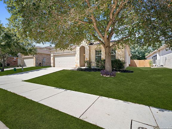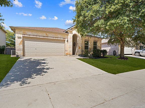 Open House Sunday, October 27th from 1-4pm also on Channel 4 @ 10:30 on Sunday! Nestled within a quaint community in Schertz, this beautifully maintained stone, one-story home offers the perfect blend of comfort and convenience. Featuring 3 bedrooms and 2 baths, the master suite is thoughtfully designed with a split layout for added privacy, including a spacious master bath with a separate tub, shower, and dual sinks. The heart of the home is the open-concept kitchen, seamlessly flowing into the family room and dining area-ideal for both everyday living and entertaining. Cozy up by the stone fireplace or step outside to the covered back patio, perfect for relaxing outdoors. This home is minutes away from Randolph Brooks Air Force Base, with easy access to IH-35 and nearby shopping. With fresh paint throughout and brand-new carpet, this move-in-ready gem is ready to welcome its next owners.