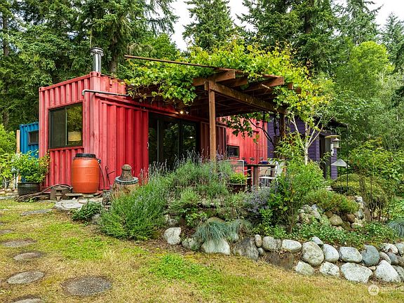 Dreamy Island Getaway, Found Minutes From Ferry! Serenity, Privacy & Sustainable Style displayed on 5 acres, artfully landscaped with two separate Shipping Container Dwellings. A perfect residence, vacation property or investor opportunity. Quality built ShelterKraftWerks; main building offers 1 bedroom, 1 bath with shower & steam, kitchen with stone counters & maple cabinets. Anderson French Doors lead to grapevine draped pergola, flagstone patio overlooking proper greenhouse, mature fig & other fruit trees, berries, fire pit & vast meadow. Secondary building offers studio with queen bed, bath w/shower, kitchenette & covered deck. Third building location has electricity ready for shop or RV. Bring your imagination, Potential is Endless!