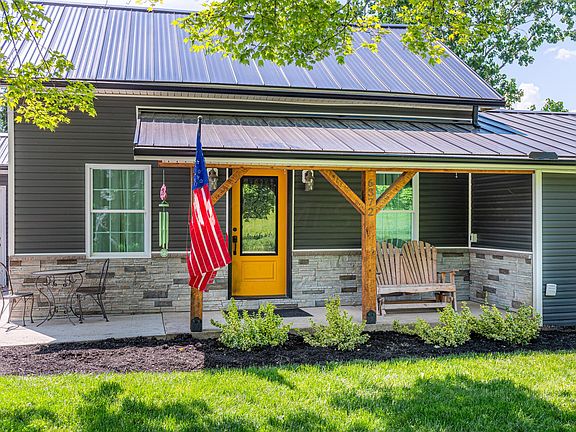 19.46-acre HOBBY FARM (woods/pastures). The barn has a newer partial concrete floor, 3 stalls, water, electric and chicken coop. From 2021-2024 the farmhouse has undergone gut-renovation entailing new plumbing, wiring, sheetrock, metal roof, siding, windows, doors, gas fireplace, custom kitchen cabinets/quartz countertops, custom vanities/granite countertops in both bathrooms, soaking tub & shower, landscaping, LVP flooring/carpet, concrete drive, and more! Impressive 30x40 insulated 2.5 car attached garage with upstairs. Living area with open kitchen, walk in pantry, mudroom. 2 bedrooms (potential for 3). Spacious primary bedroom with seating area, his/her walk-in closets, access to the deck. In that wing of the home, the walk-in shower is waiting on the new owner's finishing touch.