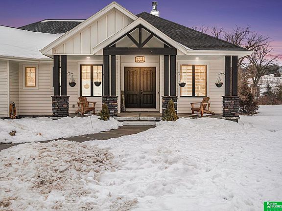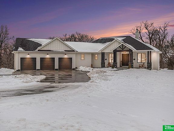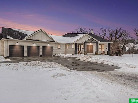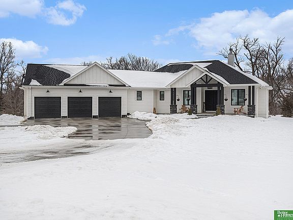 Just a few years young this incredible farmhouse ranch style home is situated on just over 2 acres of land in a highly sought after area! Soaring 9ft ceilings and open floor plan will impress even the pickiest of buyers! With about 4,000 finished square feet there is plenty of room for the family to enjoy or for hosting the next holiday. Large primary suite with a massive, tiled walk-in shower and double rain heads is just one of many great features of this home. 2 other bedrooms on the main floor with Jack and Jill bathroom. Newly finished walkout basement has 2 additional bedrooms, large family room, wet bar, full bathroom, and an additional laundry room! Cozy up to the new wood burning stove in the basement or relax on the newly added back deck that is wired for a hot tub! (hot tub for sale.) Enjoy the peace and quiet of small town living not far from Omaha!!