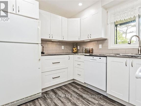 Custom made roller shadeLaminate floorsPatio doorsRenovated custom kitchenCeramic back splashLuxury vinyl floorsWall of closets
