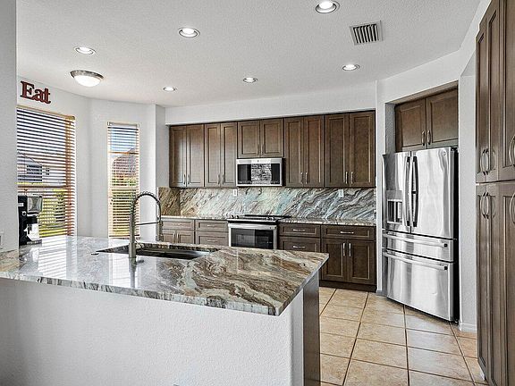 This beautifully redesigned 4-bedroom + loft, 3-bath Willow model is situated on a premium lot with breathtaking long lake views and the most spectacular sunsets. Step into your private oasis with a covered patio, sparkling pool, and fully fenced backyard--perfect for both relaxation and entertaining.Inside, the home welcomes you with vaulted ceilings, grand windows framing the waterfront, and an abundance of natural light throughout. The thoughtful redesign has created an expansive family room, oversized bedrooms, and exceptionally generous closet spaces. The chef's kitchen is a true highlight, featuring newer stainless-steel appliances, a double-door pantry, eat-in breakfast area, and abundant cabinetry and counter space--ideal for both everyday living and hosting. The primary suite is a retreat of its own, offering a sitting room, double-door walk-in closet, and a spacious bath with serene lake views. Additional features include accordion shutters on all windows, a cabana bath downstairs, a guest bedroom, and a two-car garage.