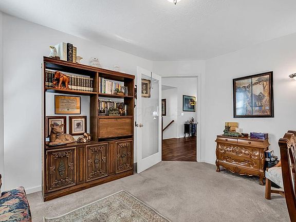 The spacious open Great Rm w/ cathedral ceiling & FP, can be served by pass thru from large kitchen w/bay eat area. Striking wood floor from entry, flows thru Great rm to DR area & hall to carpeted Bdrms. Double glass door into Den/ office at entry. Cath ceil Mstr w/ walk in closet, double sink bath, garden tub, shower & commode closet. Full bsmt is carpeted with tremendous space for recreation. Privately walled composite deck steps down to modest yard.