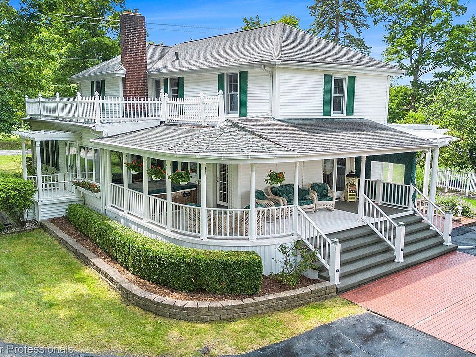 The original Perry farmhouse, nestled on 3.2 beautifully manicured acres, is a picturesque retreat perfect for relaxing and entertaining! The property features a covered gazebo that overlooks stunning English gardens, complete with two koi ponds and waterfalls as well as a firepit for evening gatherings. The huge cypress greenhouse is equipped with electricity, gas, heating and water, conveniently located between a fruit tree orchard and a large garden area with an above-ground sprinkler system. The property boasts a beautiful wraparound porch and a side patio terrace with retractable awnings, providing delightful outdoor spaces to enjoy the scenic grounds and every sunset! Inside, you'll find the original, beautiful hardwood floors on both levels and wide wood trim along with numerous spacious gathering areas, including a large living room, dining room with French doors and crown molding, cozy wood paneled library with built in shelving and storage. The sunny, four-season room is the best place to start your day viewing sunrises and sipping coffee. The home features 3 large bedrooms with updated closets and 2 full baths upstairs, and a spacious siting area that overlooks the west property. This home has been well loved and maintained over the years, with many updates such as new windows, siding, plumbing, electrical system, furnace, AC, and a new roof scheduled to be installed in August of 2024! The property also boasts a huge circle driveway lined with outdoor lamp post lighting along the pathways and ponds with an amazing 30x40 two-story barn/garage, equipped with 220 electricity, 60-amp service, ceiling fans, outlets & lighting every 6ft, water access, heat, concrete floors downstairs with drywall and stone wall along with a massive multi purpose room upstairs that is coated with spray insulation. This charming and historic home is perfect for large family gatherings and celebrations! Truly a must-see home where unforgettable memories are made!