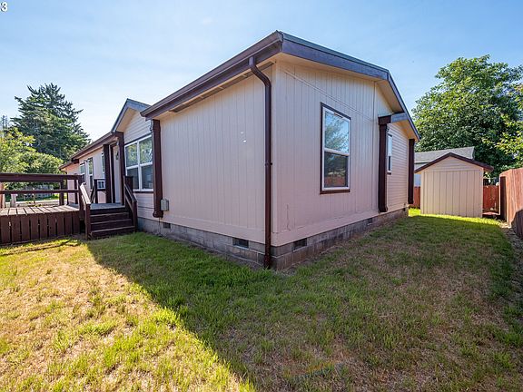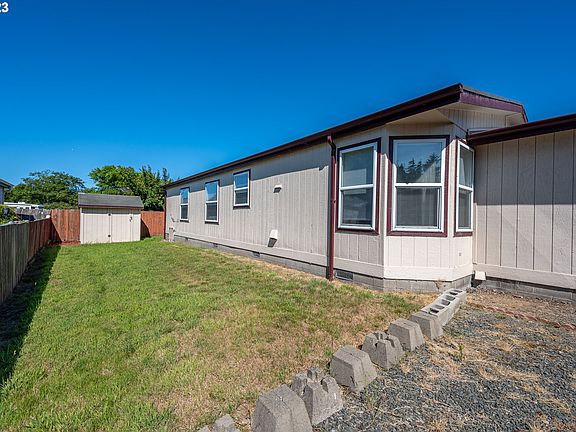 Close to the Bay! 3 Bed / 2 bath very well maintained manufactured home has great open layout all on one level with the primary bedroom offering its own bathroom, large kitchen with updated flooring throughout, Newer membrane roof with transferrable warranty. Approx 400 Sq ft attached work shop with 220 and extra storage space! Easily maintained yard,storage shed and plenty of parking! Great location if your looking to retire to the cooler climate of the Oregon coast ! Call Today