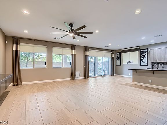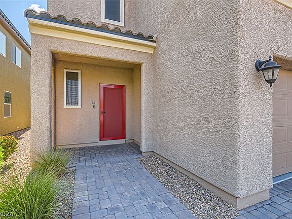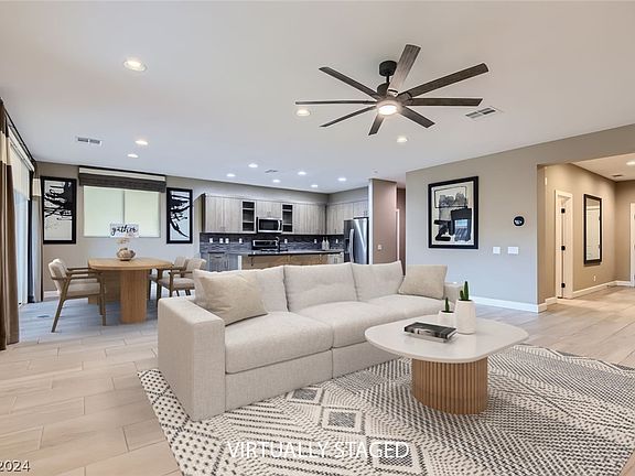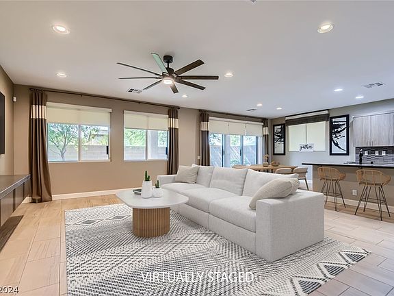 This 2393 sq ft, 3 bed, 2.5 bath home with a large loft is move-in ready! A former Model Home with top-of-the-line features throughout. Upgraded kitchen & bath fixtures, two-toned paint, upgraded tile downstairs, designer carpeting with an upgraded pad upstairs. Open-concept living/dining/kitchen space opens through a multi-slider & matching security screen door to a full covered patio & easy-maintenance backyard with turf. The kitchen features upgraded quartz countertops, Lenox Thermofoil cabinets, upgraded hardware, soft-close drawers, & Stainless Steel appliances. Recessed lighting, ceiling fans, USB outlets, & a smart thermostat add convenience. Upstairs bathrooms have upgraded quartz countertops, backsplash, & matching Lenox cabinets. The laundry room includes a Smart washer & dryer, Lenox cabinets, & a sink. Oversized two-car garage has LED lighting & epoxy coating.Paid-off solar & too many Smart features to list! Convenient to Nellis AFB, 215 & 15, grocery stores, & restaurants.