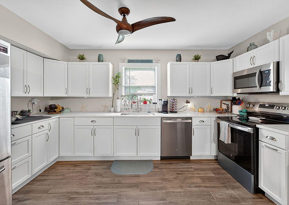 Assumable mortgage of $307,000 @ 2.375% Renovated CBS ranch style home with 4 bedrooms and 2 baths on 1/3 fenced acre. Room for boats, trailers, RV, & NO HOA. The gorgeous kitchen features quartz counter-tops, ss appliances, and new cabinets. The spacious master bedroom suite has a large walk-in closet and a private screened porch with a Beautifully renovated bathroom. New $10,000 water system. The home has a metal roof and a large storage shed. Outdoor kitchen is adjacent to the 2nd screened porch. Two min ride to I-95, boat ramp, walking distance to Walgreens, Publix, dining, shopping. !! Assumable mortgage at 2.375% for qualified buyers!!