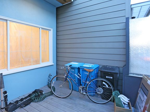 Contemporary, three-story 4BR/3BA single family home in Bernal Heights. Floors are hardwood except in baths, heating is forced air. Home is entered from the street via the porch. Porch has both a front door and glass sliding door. Large, open living room has a gas fireplace and faces the kitchen. L-shaped kitchen runs along a wall with a breakfast bar separating it from the dining area. Its all stainless appliances include refrigerator with water and ice dispenser, gas stove with hood, and dishwasher. Master and second bedrooms are located on the top floor, behind the living room. Large master bedroom has a balcony with sliding glass doors and a Bay view, as well as a huge, open, walk-in closet and its own bath with shower stall. Second bedroom is mid-floor, has a wall closet with sliding doors and is adjacent to the shared bath which has shower-over-tub. The floor below has the very large den/second living room, two bedrooms, shared bath with shower stall, stacked washer and dryer in a closet, and a storage closet. Both bedrooms have bay views. One bedroom has a walk-in closet and balcony with sliding glass doors. The other bedroom has a wall closet with sliding doors and provides access to the deck. Deck is on the bottom floor. It has a panoramic bay view including the East Bay hills and Mount Diablo. Deck level also has a workshop with industrial sink and a large storage room.