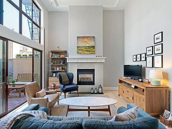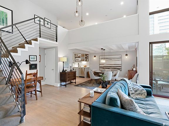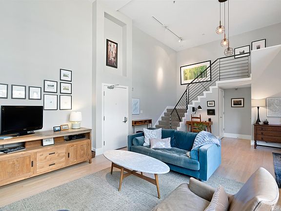 Sensational loft condo w/ spacious floor plan & chic urban design. 18' floor-to-ceiling windows bring in an abundance of natural light. The open main floor forms a continuous flow to live & entertain seamlessly. Generous scale for home office work areas. Living room boasts soaring ceilings, fireplace & access to patio that links inside to outside. Dining room w/wood beam ceiling & expansive window for light filled outlooks. Gourmet kitchen w/sleek cabinetry, stainless appliances, quartz counters, and subway tile backsplash. Laundry closet w/ washer/dryer. Half BA completes this level. Dramatic staircase w/custom metal handrails. Full floor private loft w/ 1/2 wall that exposes space below for light & openness. En suite bathroom w/shower over tub, counter w/long sink atop wood cabinetry. Community rooftop deck w/panoramic views to enjoy the SF skyline. Nearby SOMA corridor w/restaurants, shopping, museums & nightlife.