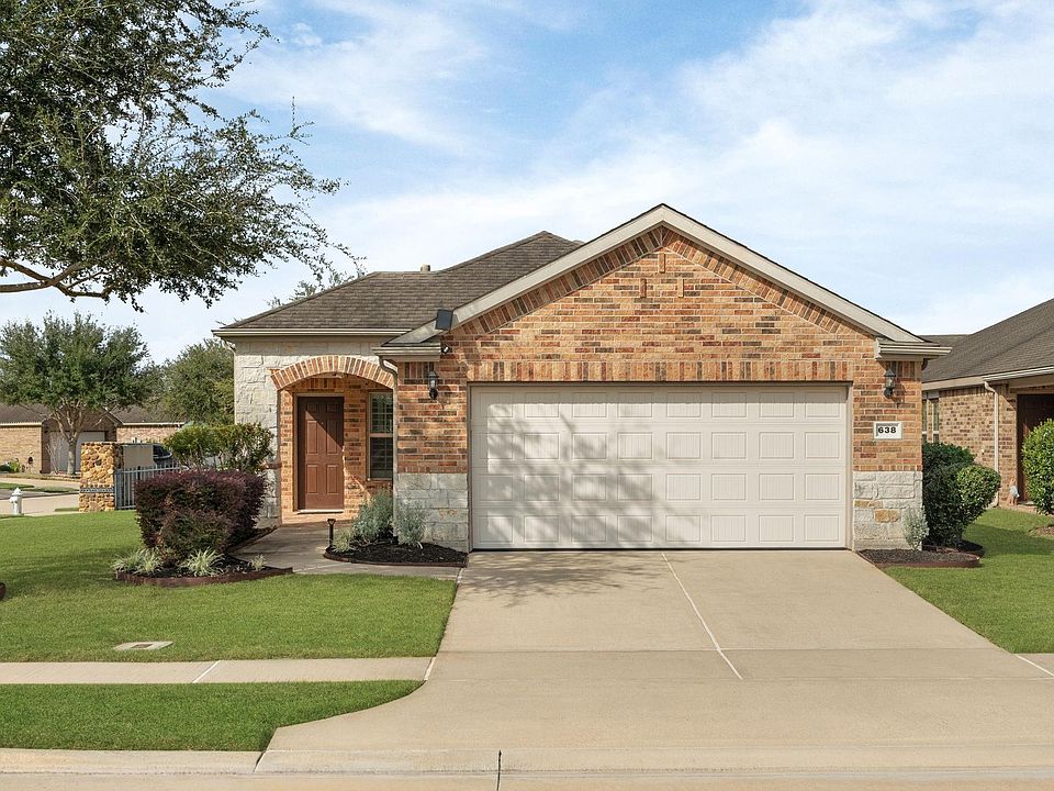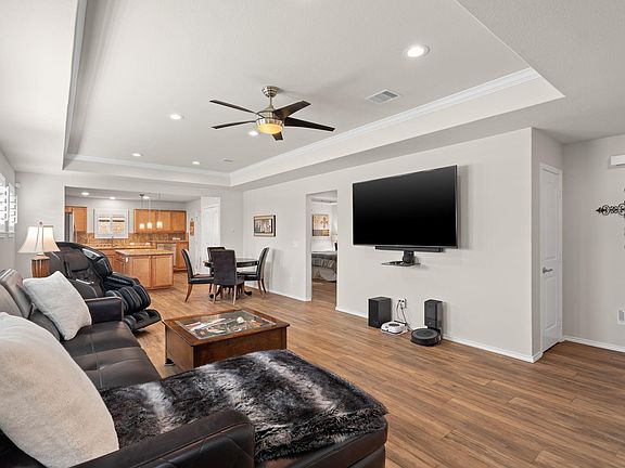 Rare opportunity to own a “Next Generation” Taft in sought-after 55+ Del Webb community! From its graceful brick archway & extended front porch to the flush, no-step entry, every detail whispers comfort & style. Inside, wood-look tile flows throughout—no carpet—paired with plantation shutters & tray ceilings that elevate the space. Chef’s kitchen shines with granite island & an elevated dishwasher for effortless living. Serene owner’s suite pampers with a tiled walk-in shower with bench, dual sinks with a lowered makeup vanity, and a bidet upgrade. Laundry sits just steps away for convenience. The third bedroom flexes beautifully for guests or office use. Practical perks include an epoxy-coated garage floor, HVAC in interior closet, and flush garage entry—all appliances and TVs convey. Energy-smart upgrades include a Lennox 16-SEER high-efficiency HVAC system, low-E3 insulated windows, and radiant-barrier roof decking. Next Gen homes hardly ever come along, make this one yours today.