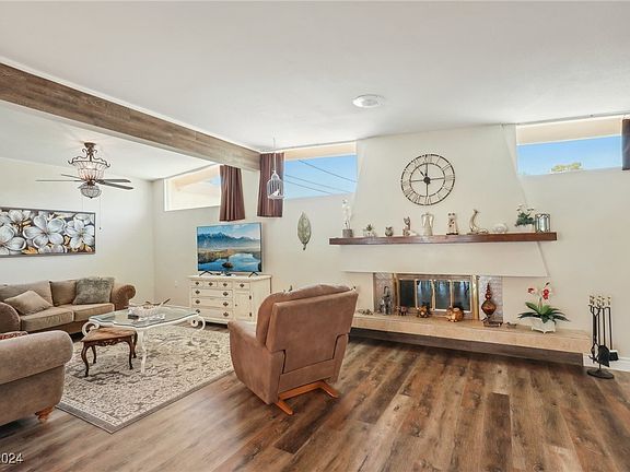 This highly sought-after single-story mid-century home in the Black Mountain Golf & Country Club is free from HOA restrictions & features RV parking, 2 luxurious primary bedrooms, & numerous upgrades. The expansive tandem garage & large driveway offer ample parking. The wide lot boasts a private backyard with real grass, mature trees, a fire pit, a full patio, & partial Strip views, perfect for outdoor entertaining or relaxing. Inside, the home has upgraded flooring, a remodeled kitchen with granite countertops and stainless steel appliances, & an oversized bar area for entertaining. The 2 primary bedrooms provide private retreats with en-suite bathrooms. Thoughtfully updated with modern amenities & mid-century design, this home is ideally located with stunning views & exceptional features.